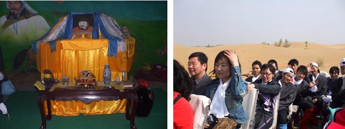 中午我們進(jìn)入了旅游區(qū)蒙古包樣式的餐廳用餐,享受蒙古歌舞。用餐完畢后我們繼續(xù)我們愉快的旅程前往成吉思汗陵。